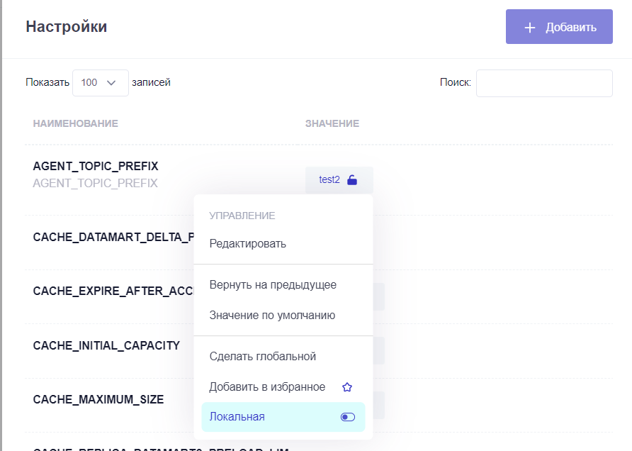 Если настройка определена глобально, то в списке настроек Datamart Platform Studio выводит индикацию и уровень, на котором определена настройка (см. Рисунок 7.13).