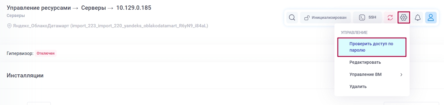 Для первичного добавления на сервер публичного ssh-ключа из интерфейса Datamart Platform Studio к серверу должен быть разрешен доступ по логину и паролю. По умолчанию для доступа к серверам в одном ДЦ используется единый логин и пароль, установленный в настройках ДЦ, но в настройках сервера можно его изменить и использовать для сервера специфический логин и пароль, если это требуется.