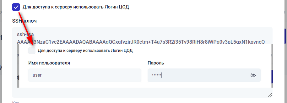 Имя пользователя, пароль и ключ доступа к серверу по умолчанию используется из настроек ДЦ. Если требуется использовать специфические данные для сервера, их можно указать в разделе Настройки ssh подключения.