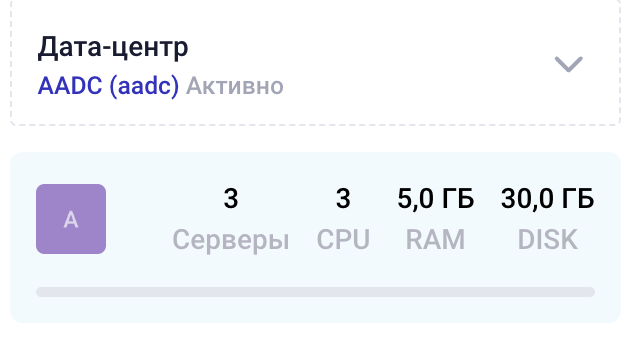 В карточке ДЦ в левом верхнем углу отображается количество серверов, зарегистрированных в текущем ДЦ и счетчик используемых ресурсов. Если для ДЦ установлены лимиты на использование ресурсов (CPU, RAM, Disk), то при превышении лимита индикация будет отображена на счетчике.