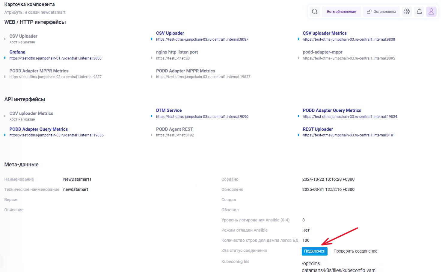В этом случае пользователь Datamart Platform Studio сможет производить добавление инсталляций приложений в среду K8s, к которой настроен доступ в файле конфигурации. Проверка подключения производится в карточке услуги (см. Рисунок 3.27)
